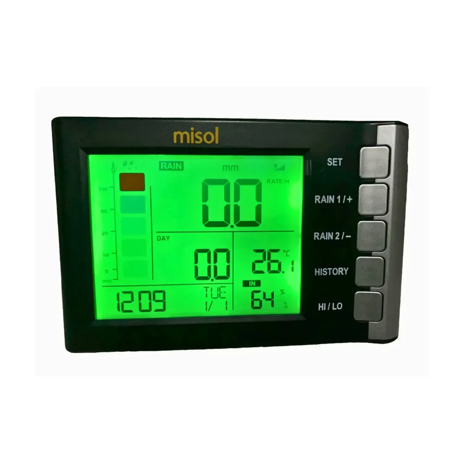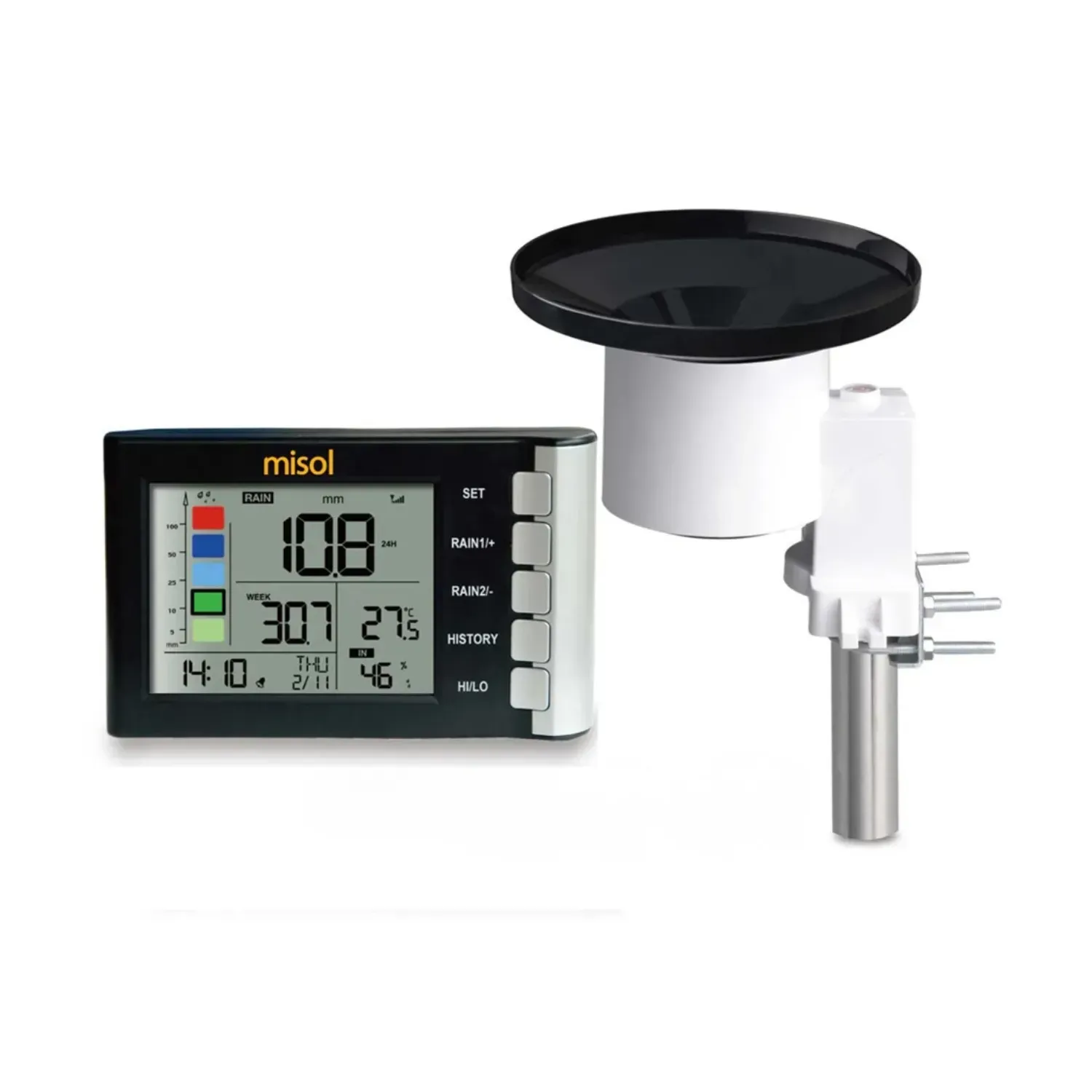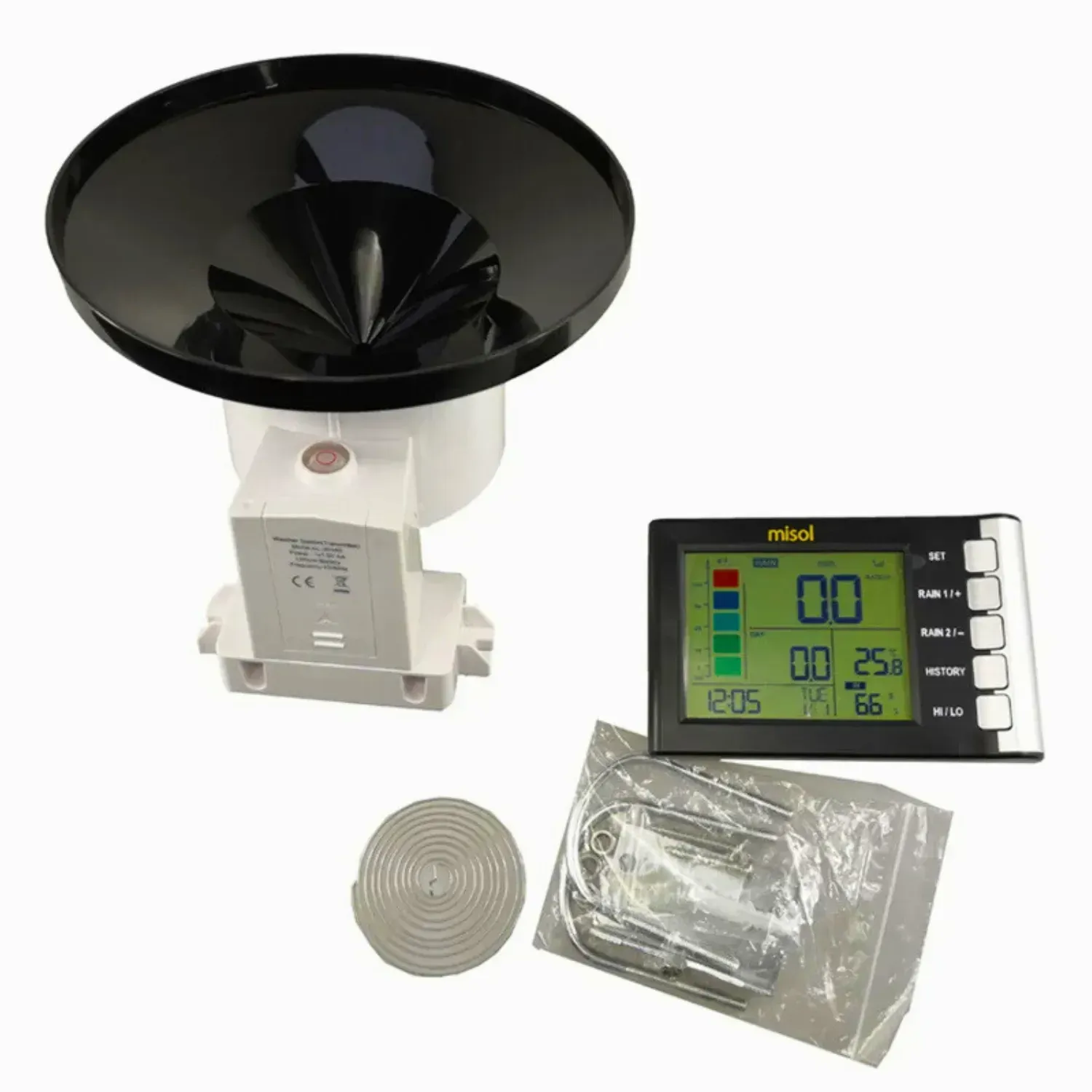 MISOL WH5360 — сучасний цифровий опадомір професійного рівня з високою точністю вимірювань і бездротовим сенсором, що працює на частоті 433 МГц. Пристрій оснащений окремою дисплей-консоллю, яка відображає кількість опадів, а також внутрішні кліматичні параметри — температуру та вологість у приміщенні. Фактично модель виконує функції компактної міні-метеостанції.